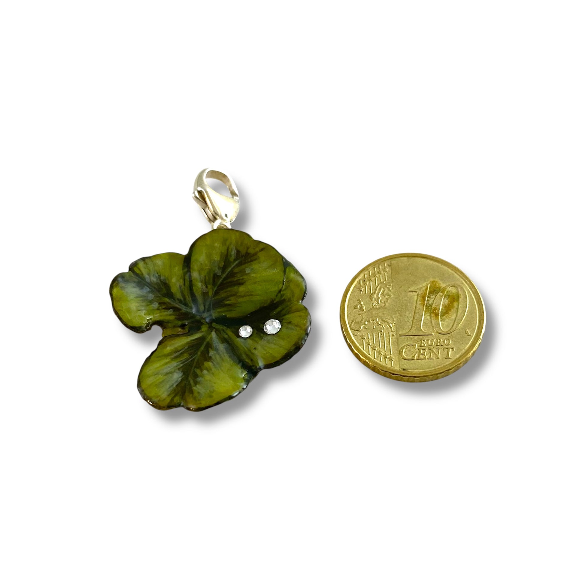 Realizzato con un vero quadrifoglio portafortuna, dipinto e rivestito di resina con gancio apribile in argento 925 e brillantini artificiali. Finitura lucida, dimensione piccola.