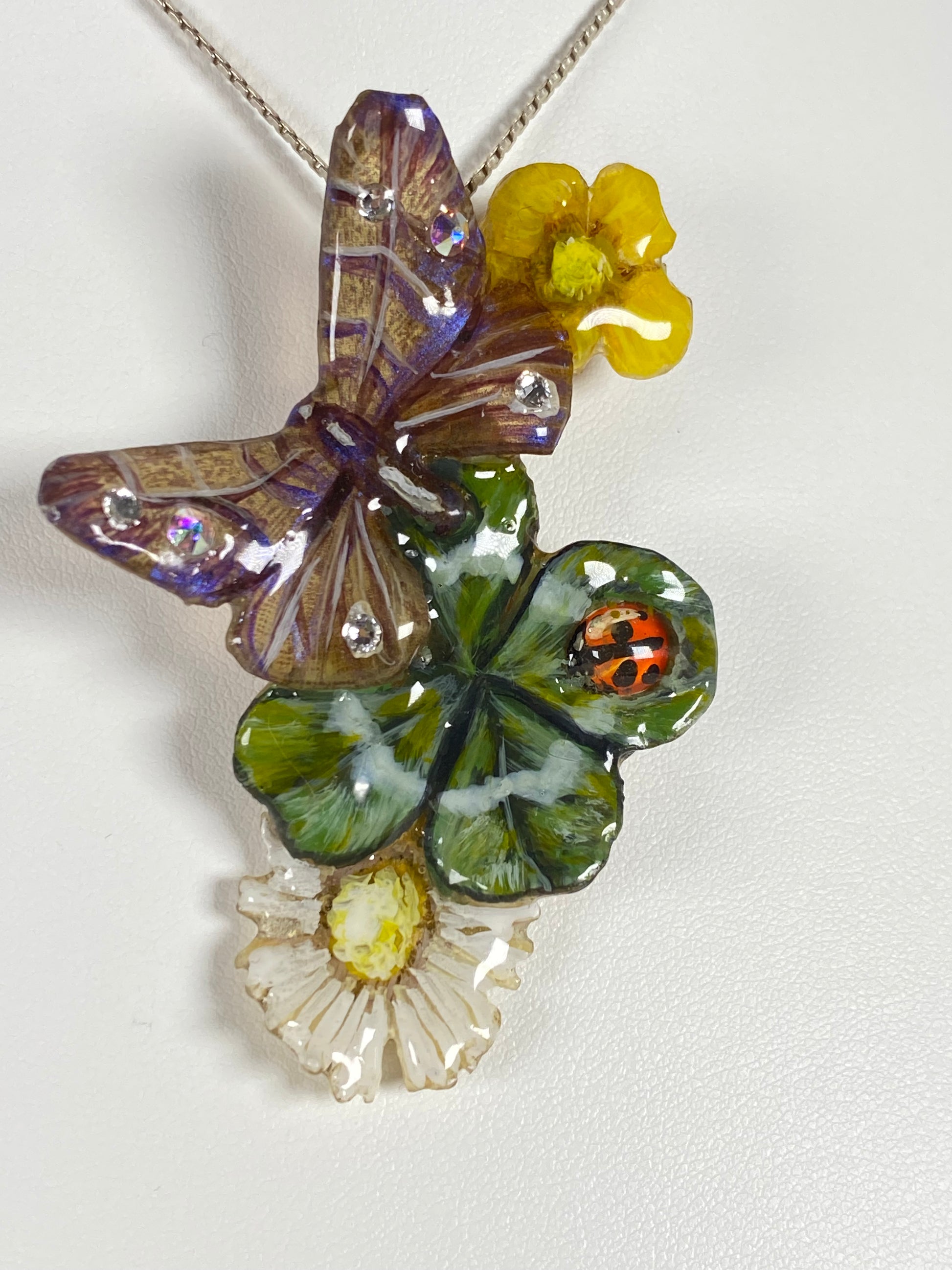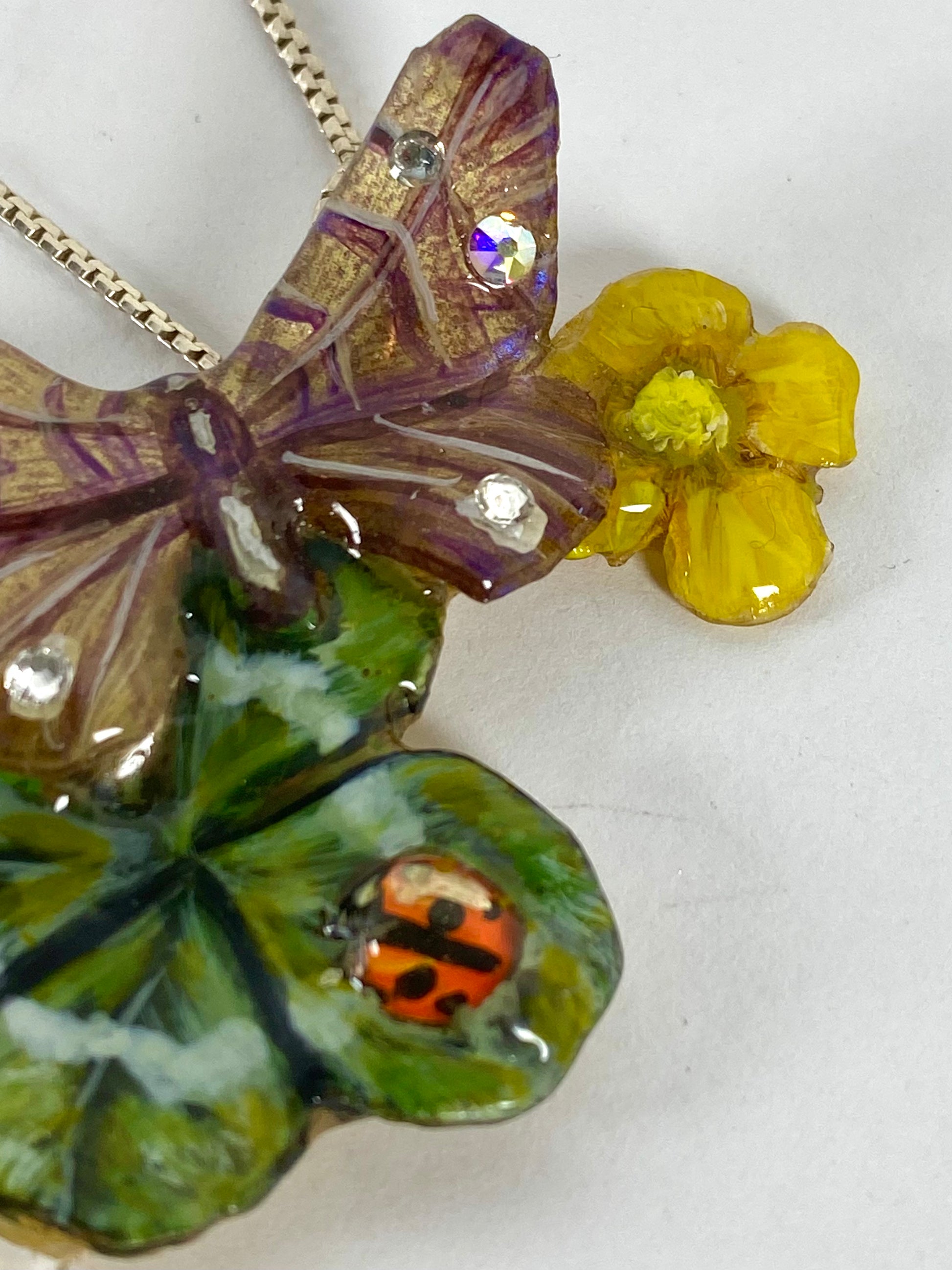 Ciondolo.realizzato con un vero quadrifoglio,una vera Margherita un vero fiore giallo e una farfalla in carta di riso, rivestiti di resina e dipinti, con brillantini Swarovski e coccinella dipinta. Gancio in argento 925. Finitura lucida, dimensione extra.