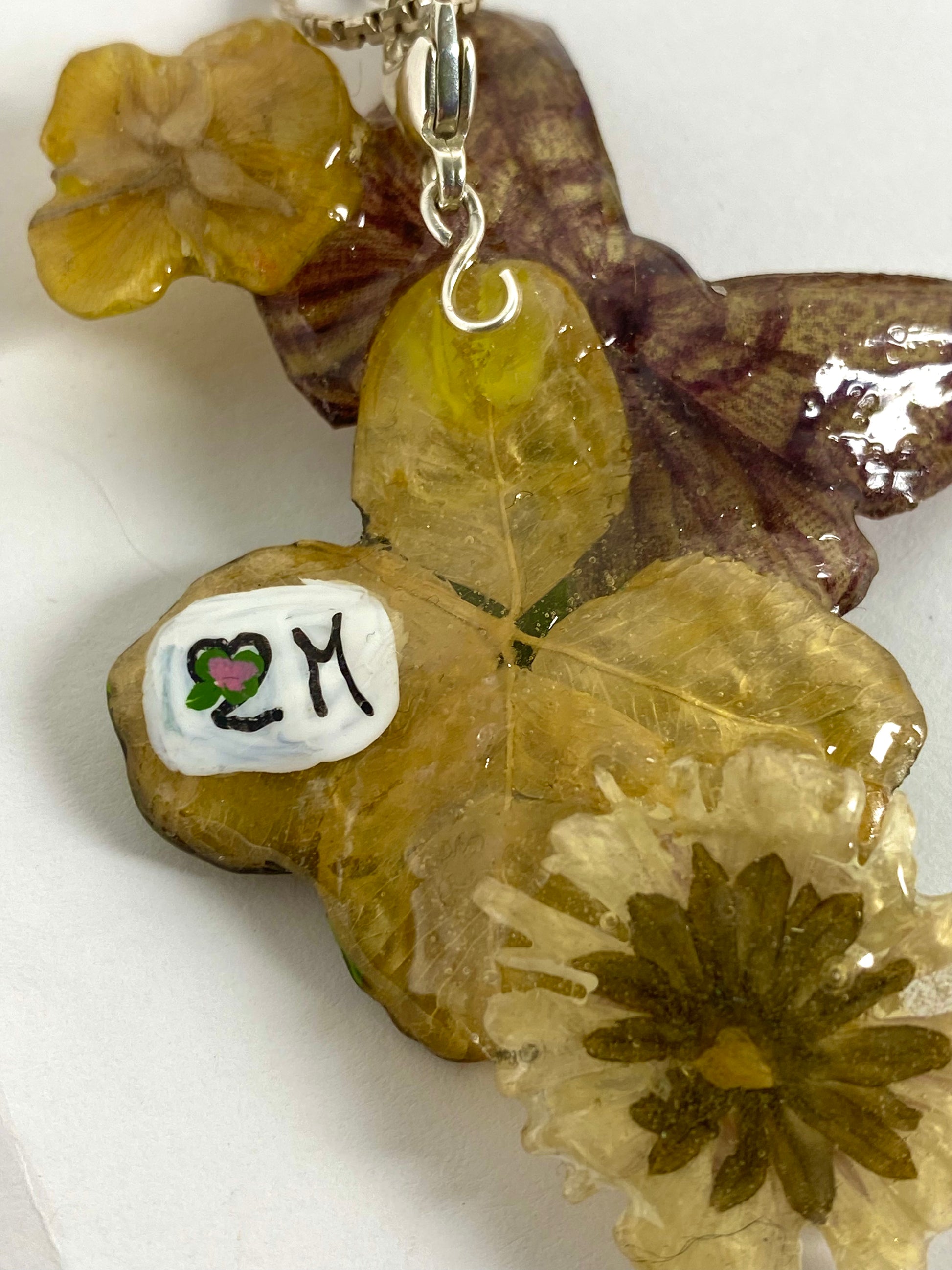 Questo ciondolo artigianale in resina racchiude un piccolo mondo di natura autentica. Al suo interno custodisce: